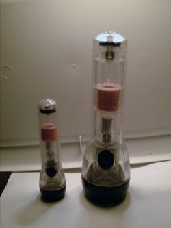 To charge the light it needs to be shaken. It works through "Induction", which is defined as: "an electrical phenomenon whereby an electromotive force (EMF) is generated in a closed circuit by a change in the flow of current" that closed circuit being contained within the flashlight itself. This circuit looks like a "spool" of copper wire, a cylindrical magnet (?) which goes through the center of the spool as the light is shaken to be charged and a small circuit board connecting the copper wire to the bulb. The larger flashlight only had to be shaken for a couple of minutes and it worked. I forgot and left it in my van for a couple of days, during an extra cold spell and it was still charged! Like the ad claimed, this flashlight does float and when put in water (I submerged it in the sink and it came right to the top once let go) and held under, it did not leak. The smaller of the flashlights (the equivalent of a mini-mag) was not as impressive. It had to be shaken at least twice as long as the larger flashlight, and to keep it on one has to hold the button down all the time. Not very convenient if you are looking for something and using this smaller flashlight, especially when you need both hands! I paid $24.90 for both of my flashlights; I saw the same set in Wal-Mart a couple of days ago for $18.95. I personally like the larger flashlight, mainly for the fact that you don’t need to worry about batteries. It’s not the best of flashlights, there are much better out there, but I thought I’d give it a try and pass on what I learned.