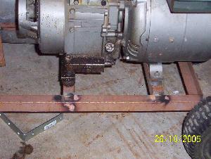I used some bed frame angle iron and the front tires of an old lawn tractor and built a new cart. I built the rectangle frame first and then welded the tires to it. Then the feet and handle went together. The tricky part was figuring out where to mount the motor and head in relation to balancing the entire cart. I planned on putting a battery behind the generator head part so that extra weight had to be accounted for. If the genny was mounted too close to the wheels and then a battery behind that, the cart would do a wheelie. :o/ So here’s what happened.