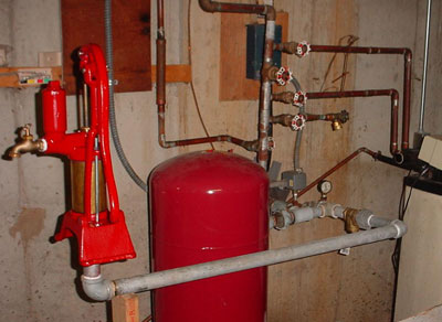 Time for the Big Test: After turning off the AC well pump, releasing the pressure in the system, and setting the valves to the proper positions (see Part 1), the pump was turned on. It started humming. But no water. About two strokes on the hand pump got water to the electric pump, which then primed and started pumping properly. Pressure in the house plumbing built up and the pump turned off. A quick check at the upstairs faucets showed that the pump provided nearly full pressure and flow to any one faucet. With two faucets on, the pressure was lower but still quite usable. Faucets off, and back in the basement the pump started to chatter or cycle on and off rapidly. With no expansion room in the system (the pressure tank in the picture is plumbed to the AC well pump and not used here), a little bit of pumping pushed the pressure up rapidly and turned the pump off. The pressure then dropped just a bit, allowing the pump to come on again. It was annoying noisy, and can’t be good for the pressure switch or pump motor.