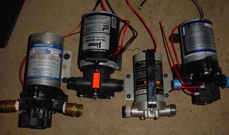 One of the first steps is to select a pump. The unit used in this setup is a SHURflo diaphragm pump (p/n 2088-343-135), purchased many years ago from Northern Tool It is rated for 3.0 gpm while pulling 5.0 amps at 12 volts. The internal pressure switch is set at 45 psi. It is described as an agricultural pump – mainly meaning that it is made with materials that are compatible with harsh farm chemicals. This pump is the one on the left in the picture below: