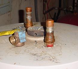 The next step tried was to add a pressure tank (or accumulator) to smooth out the pressure surges and let the pump run longer and stay off longer. As it turned out, an old water heater with a good tank was available and used for this application. First, the normal inlet and outlet pipes were capped and soldered shut: