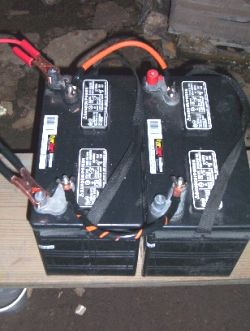 After I bought the genny, I realized I still had some "preps money" left, so I read some more articles and decided that the next thing I needed were some deep cell batteries and an inverter. I drove by Wally World after work today and got (2) 27DC-6 deep cell marine batteries (recommended in more articles than I should link to here) and I also got a 750 watt continuous, 1500 watt peak inverter. While there I figured out what I needed to hook the batteries together (a recommendation about using jumper cables and cutting them down to hook your batteries together by War in a recent post helped), but I needed some way to connect those wires to the batteries, I chose to use lugs that would fit onto the threaded posts on the batteries (tightened with wing nuts) because they would be easier to disconnect if I had to for some reason. Here's what all that stuff looks like: