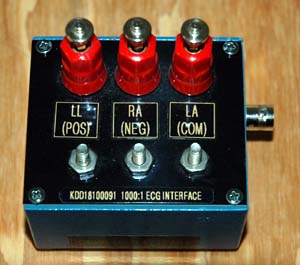 And an ECG interface box. This was done a little differently. Rather than use the Repro Film, I replaced the front panel with a piece of thin plastic used for making laminate signs. The outer skin is black on both sides, white plastic inside. An engraver mills away the top layer, exposing the white material inside. I have a 4x8 sheet of this in my shop, so decided to use a piece of it as a panel. Rather than getting fancy, I simply cut it to size, drilled holes, then used a label maker for the labels. A very quick way to make a project.