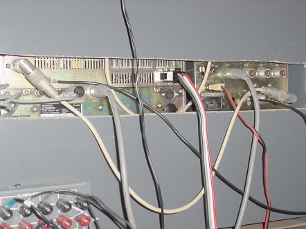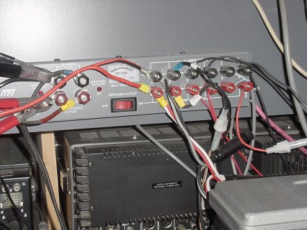 Inside, the coax run terminates at a set of antenna switches, directly above the entry, at the end of the desk The dc comes in at the same point and goes to the back of the desk, to the panel shown on the right, below...