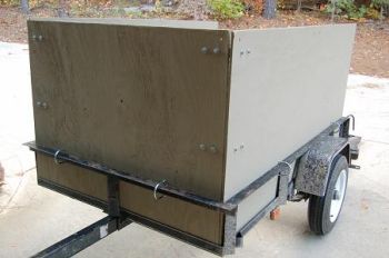 The walls are made from 5/16" plywood, about $10 per sheet at the local Lowes. The thin material was used so it’s light to move from storage to the trailer when setting it up. To weatherproof the plywood, I bought a "wrong color" can of stain at Lowes for $5. They usually have a table in the paint department of paints and stains that were mixed to the wrong color for someone, and they sell it cheap! This gallon of stain usually goes for $30!! The tarp is a 6x10 lightweight, there are some U-bolts and four angle brackets with nuts and bolts to attach them to the plywood and form the leading corners.