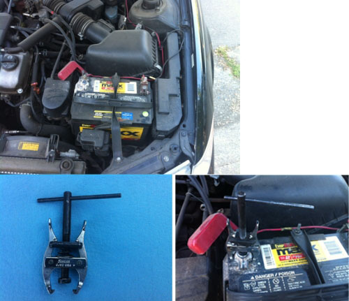 Once I got home, I started brushing the terminal off with a brass brush. Safety glasses are a must. Once I got a good amount off, I used a battery terminal puller; works extremely well. Once the terminal was free, I used a battery post cleaner to clean everything up. Once the corrosion was removed, I can see where the battery has cracked around the post. Battery posts are supposed to be rather solid and should not be moving around. I connected everything together. I was able to start the car again with great difficulty.