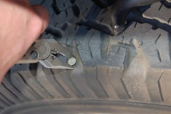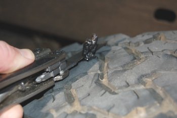 Now you have one or two things going on. In one case, when you pulled the nail out, you immediately heard the WHOOSHING sound of all the air in your tire leaving. If this is the case, you can safely skip the next step. In my case on this nail, I didn’t hear any air escaping, so I used the "spit test" on the hole to see if there was a small leak going on there.