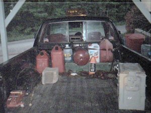 The Last Picture is what I carry in the bed of my truck; it’s not everything I carry, as I don’t have a way to secure my tools, other than putting them behind my seat. From left to right, 5 gal gas can, 6 gal gas can, 5 qts of oil behind the 1 gal, of windshield wash, 7 gal, portable air tank, 3 gal coolant, (50/50 mix), 5 gal gas can, 4-way tire iron, sitting on top of 105mm shell crate, containing 1 2-ton come-along, 1 4-ton come-along, 1 camp axe, 1 machete, 2 mill-bastard files, 2 funnels, (1 long, 1 short) 3 emergency folding reflecting triangles, 1 16 foot 10-ton tow strap, 1 east german e-tool, 1 US Tri-fold e-tool, in front of the box is some hand-cleaner, towards the front of the picture on the left is a 2-ton hydraulic jack, the gray rocket ammo case on the right hold 2 3-ton jack stands, and a 12-volt trouble light. There is more behind my seat, but I just finished packing it nicely, so I’ll leave that for another article. 8{)=