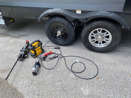 I grabbed a floor jack, cordless impact wrench, large impact socket set, dunnage, a Viair air compressor, a 12V jump pack, tire gauge, a couple of tool bags that live in the Jeep, and headed their way.