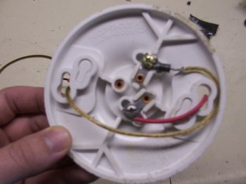 Here’s what it looks like underneath. As you can see the diode is hooked right on one of the terminals. You don’t want to set this on anything conductive as it has exposed wires underneath, for that extra safety margin you could enclose it in an electrical box or tape up the bottom. In this particular circuit I have the diode placed before the light bulb. It doesn’t really matter if the light bulb or the diode gets placed in the circuit first, just so long as they are in series. If you want an even added measure of safety, you can go ahead and add an in-line fuse. Perhaps something on the order of 2-3 amps.