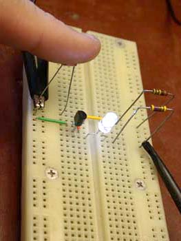![]() As you can see, there really isn't much too this. When the Photoresistor is covered, the transistor allows the current to flow through the LED. I mounted the components on a prototype circuit board also from Radio Shack. |