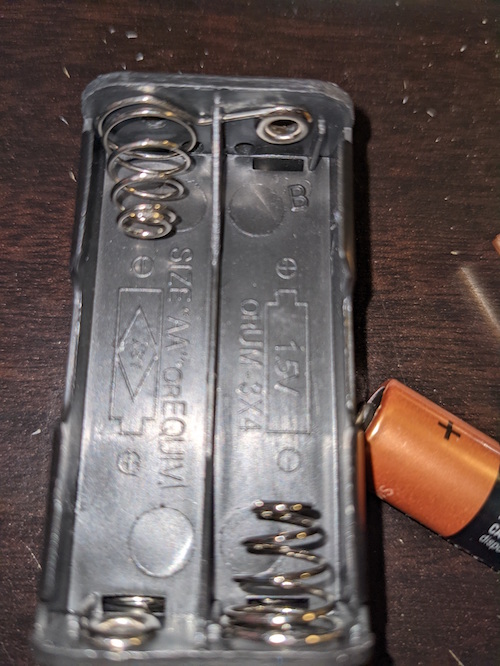 Still feeling aptly lazy I waited another 4 days before installing 4 new AA batteries in the new adapter and swapped it out with the old "broken" one. The motion sensor instantly lit up and a wave of my hand activated the flush function. Success! I patted myself on the back and picked up the old part. It still had the "new" batteries in it and I was debating with myself as to if I should pull the batteries out since these are technically new and unused. While wondering if the corrosion on the battery holder could have begun corroding the batteries I noticed a very important detail that would prevent the functioning of the motion sensor even with new batteries. See the picture below.