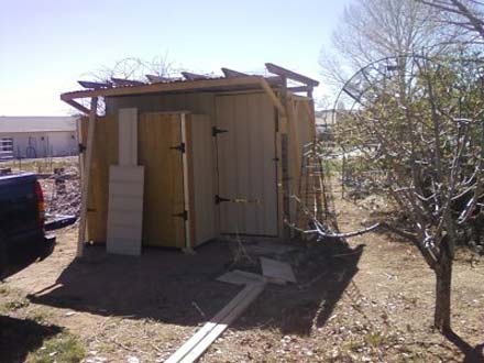To start with, careful measurements were made and a plan formulated. Money was always in mind and I didn't want to buy lumber that we didn't need to. The posts were well weathered 4x4's with chicken wire fencing on the north and south facing sides and a pergola style, timbered top. Over the Christmas break, Offspring #1 and #3 helped with the framing of the walls and putting up the recycled corrugated roofing. Then, as money was available, we bought T-111 siding for the sheeting. As an afterthought, Mrs. Scooter asked if a feed shed could be added to the front of the coop, under the roof overhang. It was easy to integrate and a great choice for feed and yard tool storage.