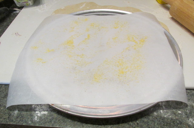 Note: The corn meal acts like ball bearings to the dough-crust to make it very easy to move around.