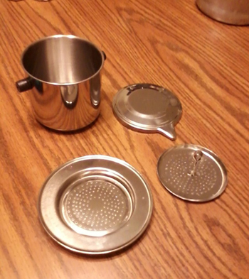I recently picked up the contraption the Vietnamese people use for making their "phin" variety of coffee. It is similar to the French Press and while I can't back the claim with documented fact, it stands to reason the Vietnamese got the taste for it from their former colonizers. It is made one cup at a time, and the Vietnamese are said to prefer it with canned condensed sweetened milk. I suspect the reason they prefer it this way is because the canned stuff is easier to come by than fresh milk or cream, and likely safer besides. Like anything related to coffee, aficionados can be quite particular about how it's done, even which coffee brand to use and which brand of condensed milk. I just use regular coffee (not espresso grind) and whatever brand of condensed milk I happen to have handy. Or milk and sugar because I'm not that much of a coffee snob. It's really just another way to make a good cup of coffee.