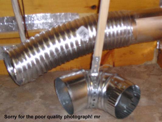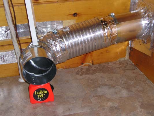 The completed bend is now connected to the outside vent pipe with a very short piece of flexible pipe. Band clamps keep everything in place and metal tape securely seals the connection against air leakage.