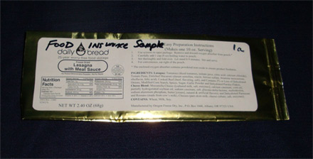 I first checked with Food Insurance. I browsed through their web site and could find no samples available. I sent an email to their customer service and asked if they offered samples. They responded and said yes, but samples can only be ordered by phone. So I called them to inquire about the samples. I was told they offer five different sample "pouches" at $5 each. I asked for two of each type of sample and was told that there is a limit of one sample pouch per order. I ordered Chicken A La King but ended up receiving Lasagna with Beef.