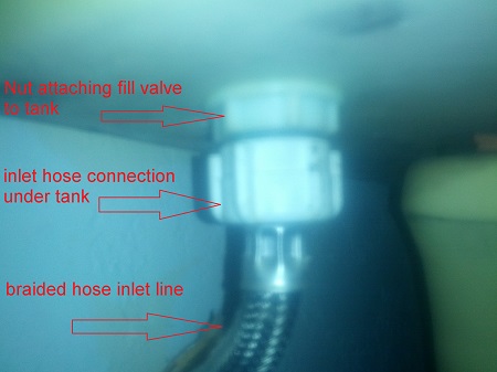 Once I have almost all the water out of the tank I slip the small bucket under the inlet pipe to the tank and unscrew the inlet pipe, this connection is normally just hand tight but it might be stuck if so use a pair of pliers or a basin wrench to loosen the connection. If your replacing the fill line go ahead and disconnect the end at the valve and set the line aside. I usually replace copper pipe lines with a new braided flexible line.