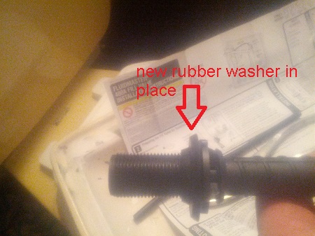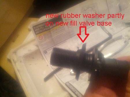 With the old fill valve out of the way you can begin installing the new fill valve. Adjust the height of the new fill valve according to the instructions that came with the new fill valve. Place the new rubber washer on the new fill valve and then put the new fill valve into the hole in the bottom of the tank. From the bottom put the new nut on the fill valve, hand tight you don't want to crack the porcelain tank. That said all the fill valves I've replaced have been on the left side when facing the tank. This means I usually have to use my left hand to remove and replace the fill valve due to tight work spaces so I use a pair of pliers to tighten the nut slightly more, not much more just slightly I don't want to crack the porcelain tank by over torquing the nut I just want to make sure the rubber washer is compressed enough to seal the hole.