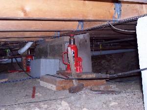 I had to lift the building and then put in posts and after that was done I needed to bolt the buildings together. I took 3 of my jacks and figured that 36 tons of lifting force would be sufficient. :) The job could have been done with one jack. However, I would have created more work by having to move it around multiple times. It was easier to have 3 in 3 different places.
