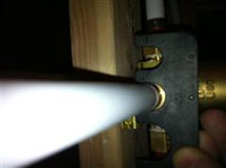 After all was crimped in place, I turned the water back on and checked for leaks. No leaks and all was well. I then flushed the system and installed the Delta cartridge into the faucet. I am just using a piece of 1/2 inch galvanized pipe with a 45 degree elbow for the flushing. When I get the tile installed I will have a proper tub spout.