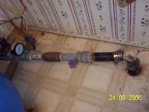 The old piping would be reused so I unscrewed it from the old tank which then got heaved out the door. I cleaned up the male threads and wrapped Teflon tape around them and screwed the pipe into the new tank.