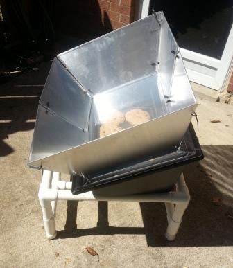 If the oven isn't getting to the temperature, I add the reflectors. With the reflectors, I don't have to be a slave to re-positioning. Most foods are done in less than 2 hours. If I'm cooking a hunk of raw meat, that takes longer and will require me to reposition it once or twice. When repositioning, I watch the shadow to make sure it's straight and true to know when the oven is exactly pointed right – then move it about an inch in the direction the sun will be in another few minutes.