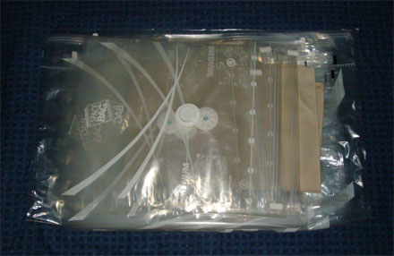 Each bag is basically a big double zip lock bag with an air valve assembly as shown in the next picture. They are made of bi-axial layers of polyethylene and nylon and are airtight and watertight. The thickness of the bags is 2.2 millimeters.