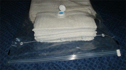 So, I just pressed the vacuum machine nozzle against the valve and that did great. The bag compressed to about half-size as the air was vacuumed out. The towels I used where pretty thick so half-size was great. But, I wasn’t really worried about space as much as I was about keeping the towels protected.