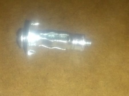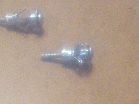 Here are a couple of pictures of some small toggle bolts. Note that there are a couple of spurs on the back of the washer face. This helps to keep the metal cage from just spinning while you tighten the bolt to expand the metal cage. The second picture shows two toggle bolts with cages expanded just so you can see how the cage expands when the bolt is tightened and can accommodate different thicknesses of material.