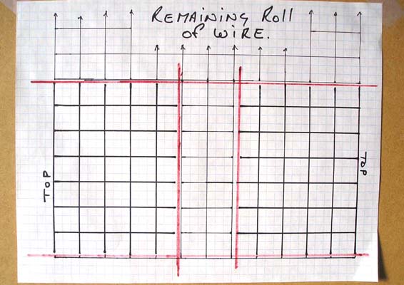 As you can see from the cutting diagram the width of the roll of wire makes two cages. The outside edges of the roll forms the top for a smoother finish to the cage. The bottom of the cage is towards the center of the roll of wire. This layout also takes advantage of the natural curl of the mesh when forming the cage cylinders.