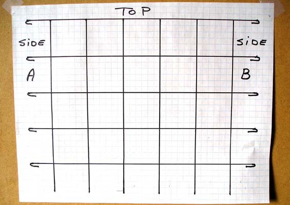 The next stage of the process is rather lengthy but it can essentially be completed in the workshop as time permits. A great winter works project. If you refer to the second diagram that is what your blanks should look like. It will be five squares wide and four squares high. The bottom or support spikes should be about six inches long. The spikes on side A and B are also about the same length.