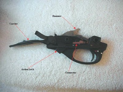 11. While lifting the rear of the trigger assembly slide it to the rear and remove. Note: do not let the hammer fall while the trigger assembly is out of the firearm. To keep this from happening always keep the safety engaged.