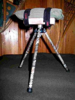 There are many different shooting rest designs out there. Because I don't always shoot from the bench I wanted something portable. A Harris Bi-Pod would work nicely but it was/is not in the budget. One day I saw a small tripod in a varmint magazine being used in the field. It was small, light, collapsible AND was very similar to a sturdy metal table top tripod I had on an old spotting scope. Using a piece of hardwood for a platform, a small sandbag (the pocket of some discarded CF combat pants) held on with velcro straps (from a UPS) and some camo duct tape this tripod was functional in short order. There is a bolt that runs through a vertical shaft and hardwood platform that is tightened with a wing nut to allow for a small degree of vertical adjustement. The unit is small (~9-10") and it fits easily into my butt pack. The cost was free to me but I have seen similar scopes with tripods at yard sale for next to nothing.