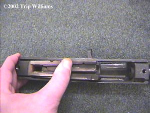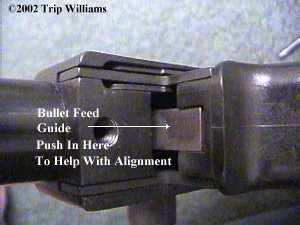 So here's the trick... The receiver housing has a "bullet feed Guide" that sticks up from the trigger assembly.. it'll wiggle around a little if you touch it (It's supposed to). This bullet feed guide MUST slip into the receiver housing BEHIND the barrel, NOT under it! When you slip the trigger assembly into the receiver housing, it'll ALMOST fit with the bullet feed guide UNDER the barrel.. this is a NO NO.. rock the feed guide so that it sits behind the back end of the barrel as shown below... now everything should EASILY line up and go back together.