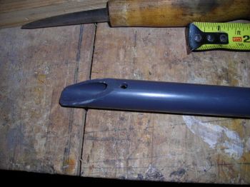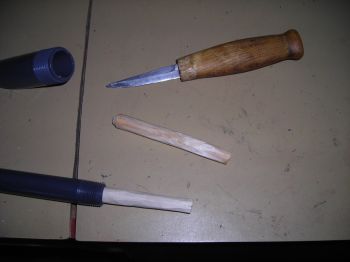 Shave down the stick so it fits freely into the 1/2" pipe. Cut it in half and round the ends a little. You will trim it to specific length later.