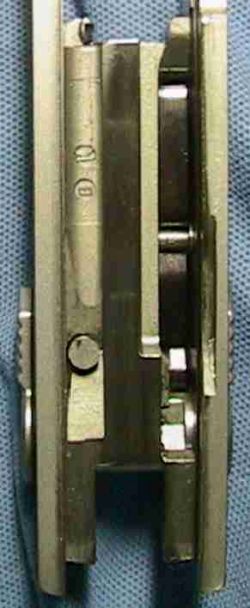 Now that you have the slide locked back, and the ejector pivoted downward, you are ready to remove the slide stop. This piece locks the slide to the frame. You will note on the left side of the frame and the left side of the slide there are two small lines. These lines are alignment marks. Release the slide stop, and move the slide alignment mark to the frame alignment mark. While you are holding the slide in the position, push the slide stop out from right to left.