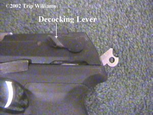 The Decocker is designed for left or right hand use... the decocking lever extends through the frame and has a duplicate lever on the other side of the weapon.