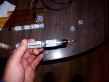 I armed another injector and carefully gripped the sides of the black tip with my fingers and pulled it back. The needle popped out and the epi shot about 10 feet across the room. Hmm…there’s a lot of pressure behind these things…cool.