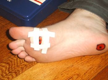 Now suppose you’ve done all this and your feet are still rubbing blisters. You can still treat the areas that are rubbing, " hot spots", before they become full fledged blisters by applying mole skin from your first Aid Kit (You DO have a first Aid kit, right?). Mole skin takes the pressure off the " hot spot" allowing the swelling to go down.