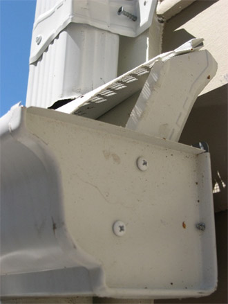 The endcaps are attached and sealed using gutter caulk, and gutter sheet metal screws, to the ends of the downspout adapter. Next, the downspout straps are easily bent to form the supports for the gutter screening material, which I set at a 45 degree angle and then screwed into place. This forms the first stage rainwater cleaning and collection process...