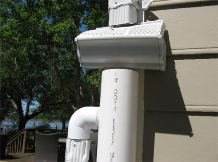 The down spout filter unit then sits on top of an 8 foot long, 4 inch diameter PVC pipe (this and the misc. PVC part were under $40). About 6 inches from the top, I cut a 2 1/4 inch hole and connected a 2 inch PVC elbow using a very short piece of 2 inch PVC pipe, attached with a strong adhesive. I then attached a downspout elbow and a short downspout section to run the water into the first of four barrels.