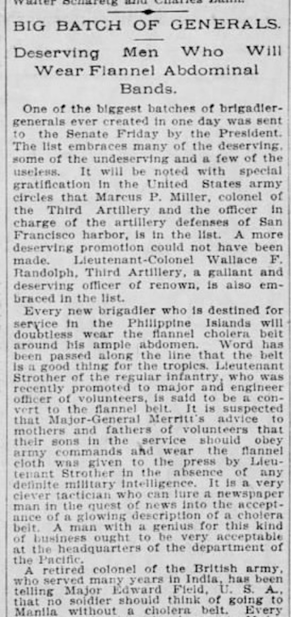 The article linked above notes that medical experts in the United States either recommended against their use or were at best indifferent. If you look up "cholera belt" in Wikipedia, you'll discover, near the bottom of the entry, a link to a sharp-tongued newspaper clipping from the San Francisco Call (May 1898) related to the American occupation of the Philippines. It discusses, among other things, a British medical officer's adamant advice on the cholera belt, and it does so in a clearly dismissive and derisive tone. The Wikipedia entry is unintentionally funny inasmuch as the obvious sarcasm on the part of the journalist has altogether escaped the notice of the entry's author.