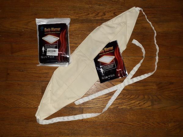 One of these techniques was a modern wrinkle on the belly-band. In American drugstores, you used to be able to purchase a simple belt that looks like a cummerbund in reverse, made of something that looks like fibrous, porous paper and Velcro tapes. This cummerbund had two pockets, into which go a disposable "Heat Pack" envelope. These items are sold primarily for sufferers of lower back pain, and I've used them for temporary relief of kidney stone pain. In this last regard, they don't work nearly as well as sitting in a tub of extremely hot water, but you can't take a tub of extremely hot water with you wherever you go. So for pain at the level of kidney stones, the heat-pad is "better than nothing."