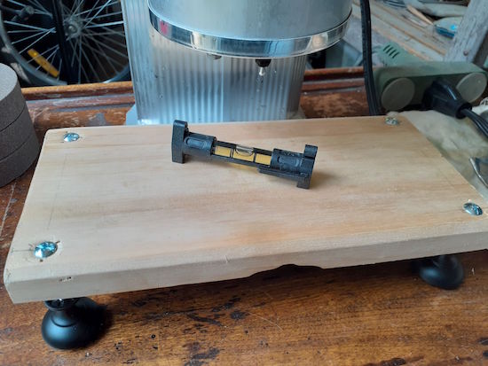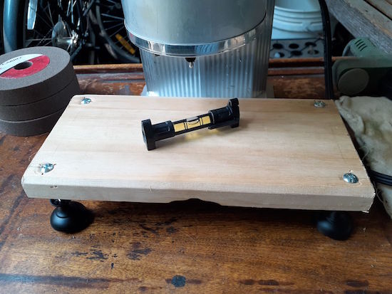 I set up the level table underneath the spout and leveled it according to the method I laid out previously. The bubble needed to go to the left, so I rotated the feet both out (with my left thumb moving to the left), until the bubble was carefully centered.