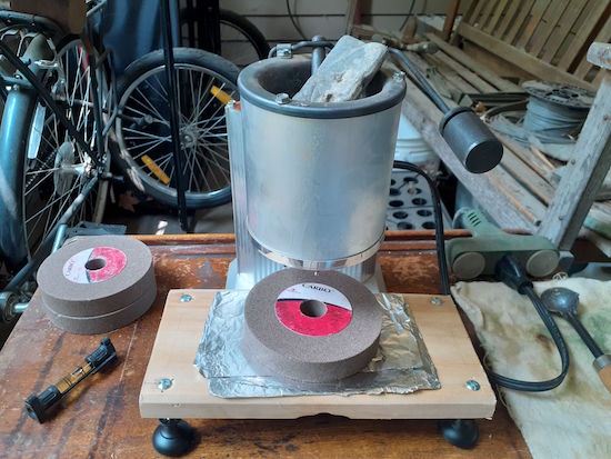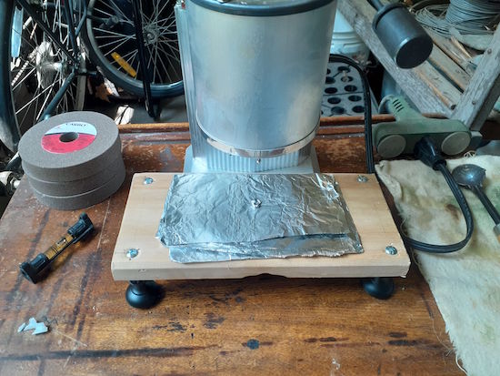 Once the table was leveled, the furnace was plugged in and the metal melted in the common manner. Whenever I cast anything, I put a piece of aluminum foil underneath the spout because as you can see, my furnace has gonorrhea.