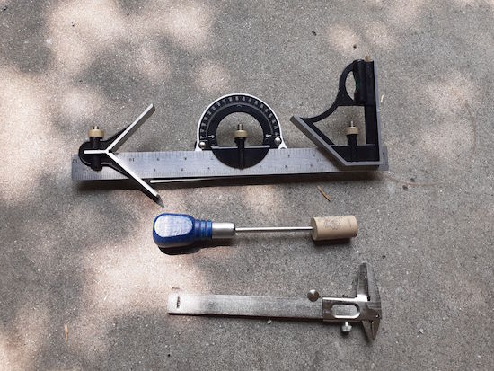The next photo shows something I bought on a lark and never thought I'd use. I already have a combination square, but one day at Harbor Freight I saw this combination-square-on-steroids and picked it up. It turned out that square-turned-sideways doohickey was exactly what I needed in order to accurately locate the center of the wheels for punching. I use the calipers all the time and needed them to measure the grinder spindle and drill bit (drill bit sizes are best thought of as "nominal," though they're not as fictional as "nominal" lumber sizes).