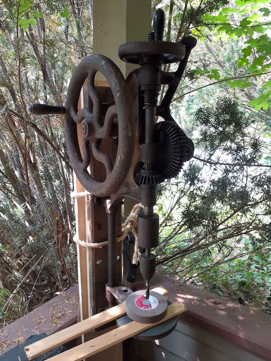 Now it was time to drill the holes. The best thing for this kind of work is a drill press, and just a few weeks ago I got my "post drill" hand-crank drill press back from a Lodge Brother. He had offered some time ago to sandblast it for me, but he soon took ill and could not finish the work. I got it back more-or-less in the shape I'd given it to him; and while I'd rather have had it all spotless and shiny, ready to be painted, I can't hold it against someone when misfortune overtakes them. So for now I'm content with the thing having a rust patina but all the working surfaces cleaned and oiled/greased. I didn't get it just for this project; in fact, I bought the post drill before the grinder. It's just been away for a long time.