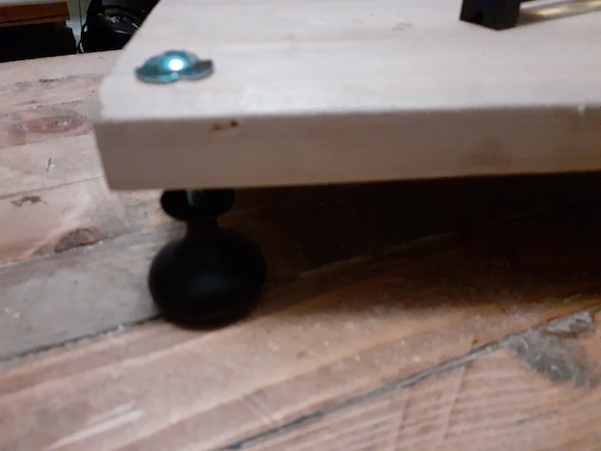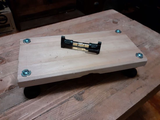I do my casting on my front porch, but this porch isn't level. This isn't a problem when I'm holding a bullet mould underneath the spout of the furnace; but the present project will be different. I needed a working surface about the size of a small cutting board that can be leveled, so I have somewhere to put the wheel while the babbitt-metal goes in the hole. And while I'm sure I could find such a thing ready-made, I'll be damned if I'm going to buy one when I can just make it for pennies-on-the-dollar, and be sure it's fit-for-purpose.
