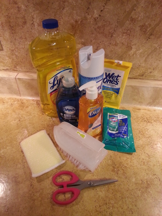 I include dish soap, antibacterial Dial soap in a pump bottles, a general disinfectant cleaner, a hand brush, disinfectant wipes, scrubby pad and scissors.